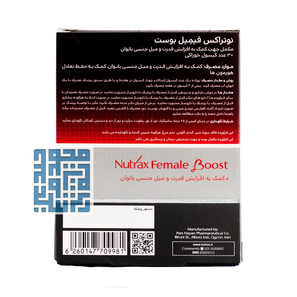 مکمل زنان فیمیل بوست نوتراکس محصولی است که توسط شرکت ایرانی پارس حیان تولید میشود. این مکمل با نام تجاری Female Boost در قالب ۳۰ عدد کپسول در یک بستهبندی عرضه شده است. این ویژگیها در کنار اعتبار برند نوتراکس و سابقه شرکت پارس حیان در تولید مکملهای بهداشتی، جایگاه ویژهای به این قرص فیمیل بوست بخشیده است.