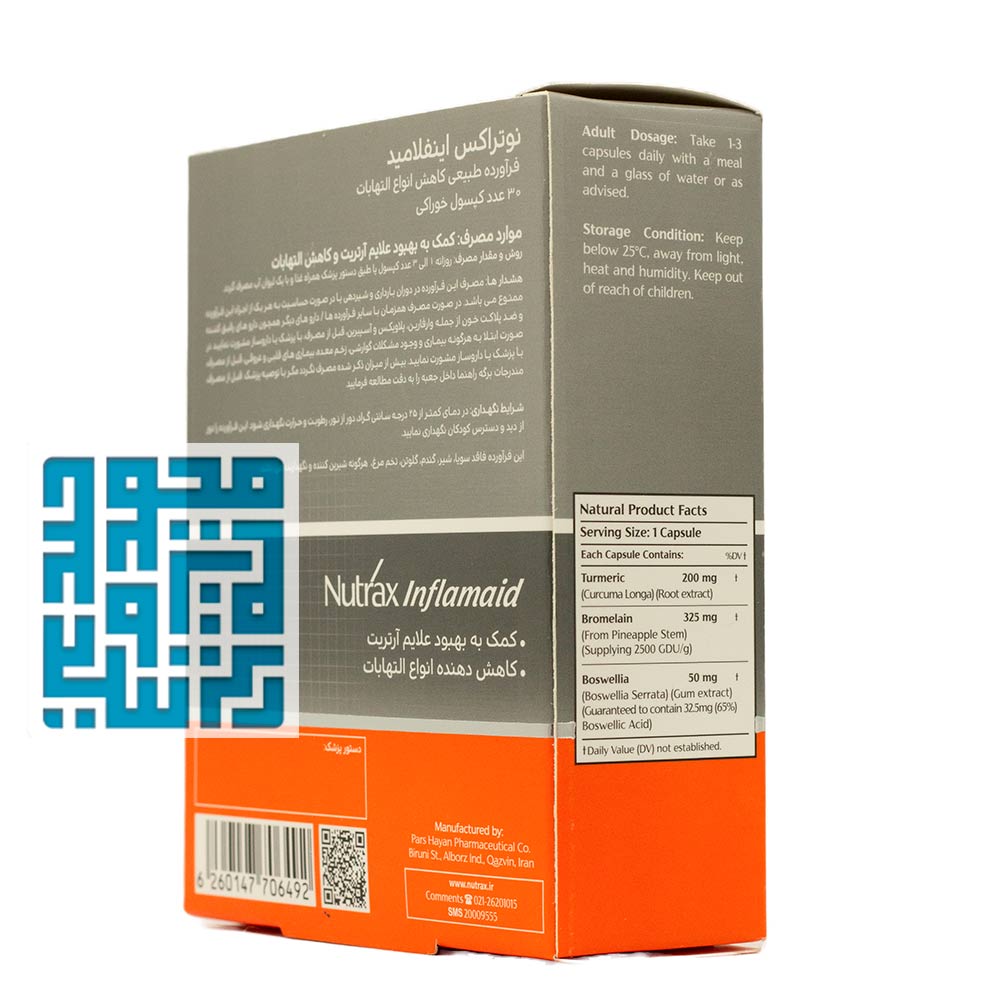 کپسول اینفلامید نوتراکس یک مکمل غذایی طبیعی است که برای کاهش التهاب و بهبود علائم آرتریت استفاده میشود. این مکمل کاهشدهنده درد و التهاب بوده و یک مسکن کاملاً گیاهی محسوب میشود. کپسول اینفلامید نوتراکس حاوی عصاره گیاهان تورمریک، بروملین و باسولیا بوده و فاقد سویا، شیر، گندم، گلوتن، تخممرغ و هرگونه شیرینکننده و نگهدارنده است.