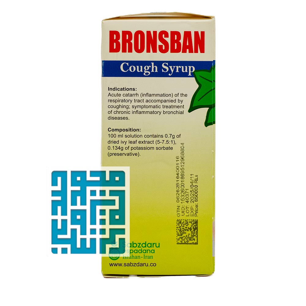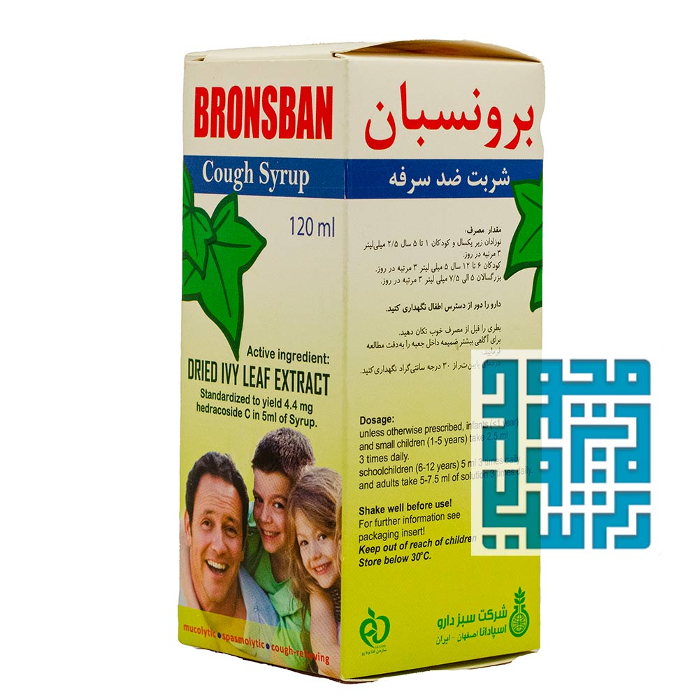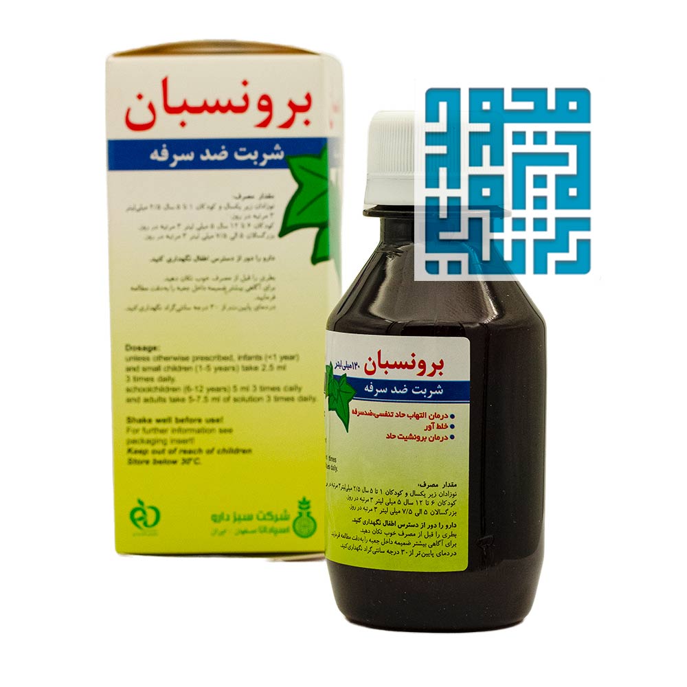 شربت ضد سرفه و گیاهی برونسبان برای درمان سرفههای حاد و کاهش تعداد دفعات سرفه در نظر گرفته میشود. این شربت حاوی عصاره برگ عشقه یا پیچک بوده و خلطآور است. شربت ضد سرفه و گیاهی برونسبان به درمان برونشیت و التهاب حاد تنفسی کمک بسزایی کرده و در بهبود عملکرد ششها مؤثر است. این شربت همچنین به تنفس بهتر در افراد مبتلا به آسم کمک میکند. شربت برونسان سبز دارو یک محصول کاملاً گیاهی بوده و مناسب برای کودکان و بزرگسالان است.