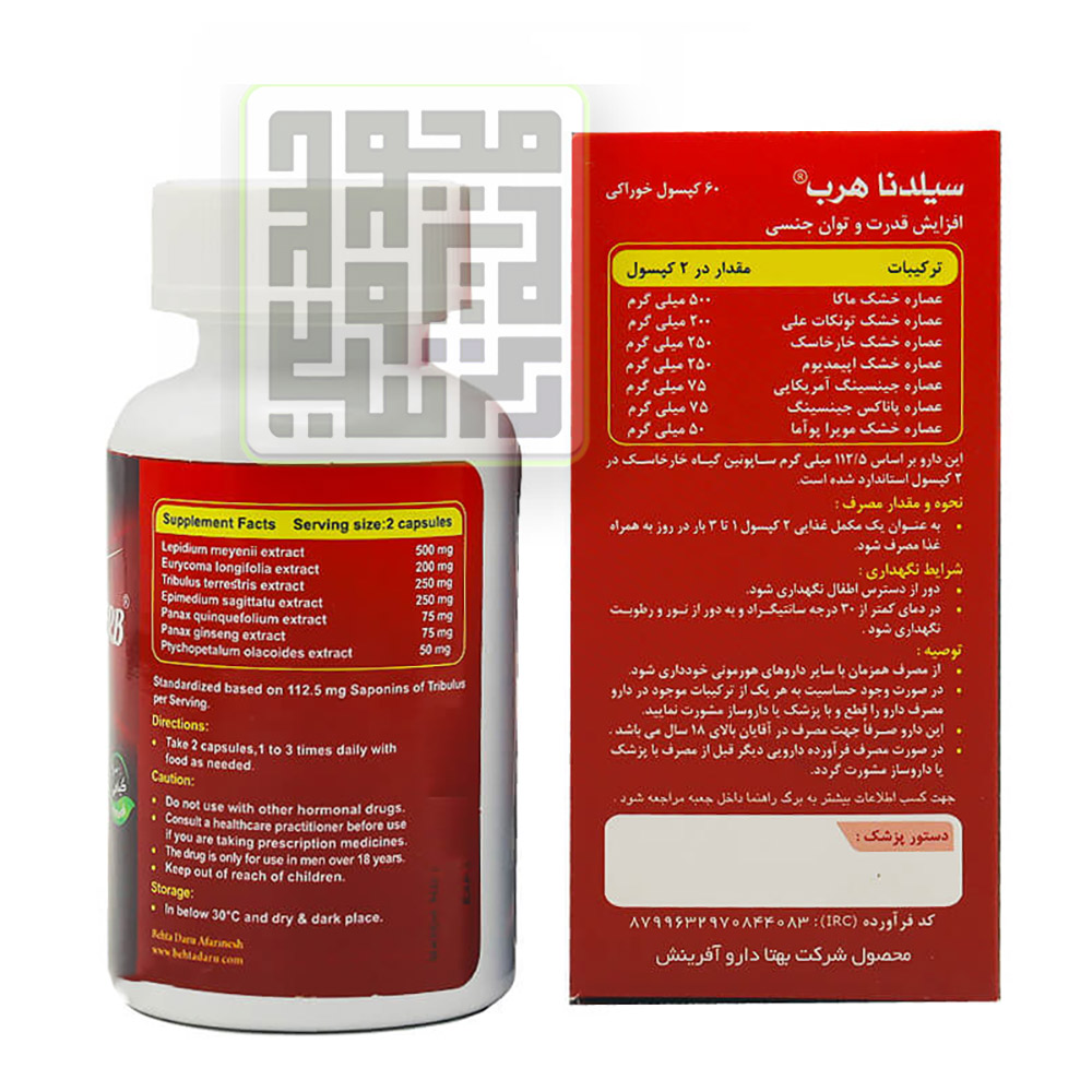 کپسول سیلدناهرب یک مکمل دارویی، غذایی، درمانی مناسب برای آقایان است. کپسول سیلدناهرب بهتا دارو یک مکمل بسیار مناسب برای تقویت قوای جنسی آقایان است و به‌عنوان یک مکمل باروری در مردان مؤثر است.
