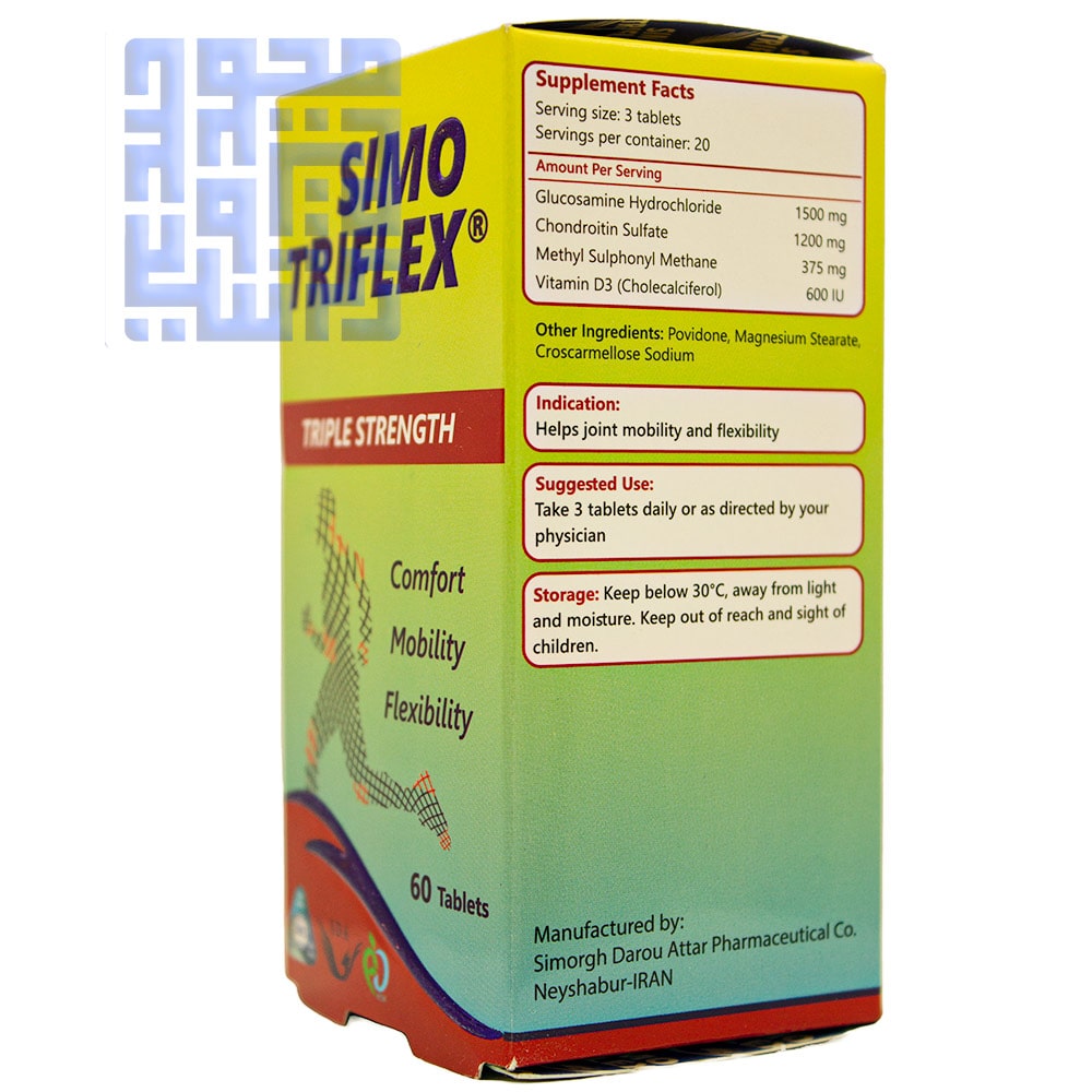 قرص سیمو تری فلکس سیمرغ دارو یک مکمل غذایی دارویی بوده که بهصورت تخصصی برای استخوان و مفاصل در نظر گرفته میشود. این مکمل به افزایش و بهبود تحرک کمک کرده و در انعطافپذیری مفاصل مؤثر است. قرص سیمو تری فلکس گلوکزامین حاوی گلوکوزامین هیدروکلراید، کندرویتین سولفات، متیل سولفونیل متان و ویتامین D3 است. مصرف این مکمل در کاهش درد و التهاب مفاصل مؤثر بوده و به درمان مشکل خشکی مفاصل کمک فراوانی خواهد کرد.