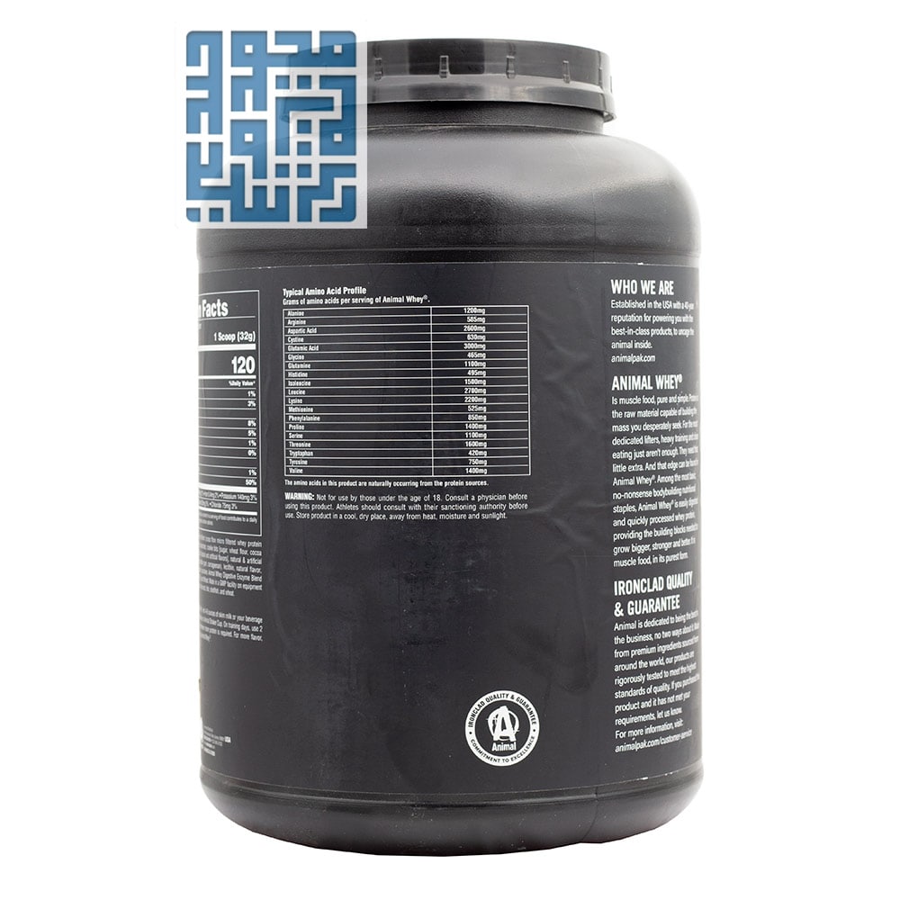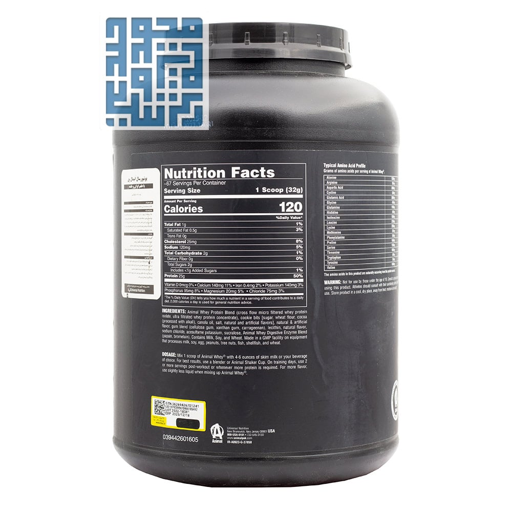 در هر پیمانه (۳۳ گرم) از وی انیمال یونیورسال، ۲۵ گرم پروتئین وی خالص وجود دارد. این مقدار ترکیبی از پروتئین وی ایزوله و کنسانتره است که جذب سریعی دارد و نیاز بدن را برای رشد و بازسازی عضلات تأمین میکند.