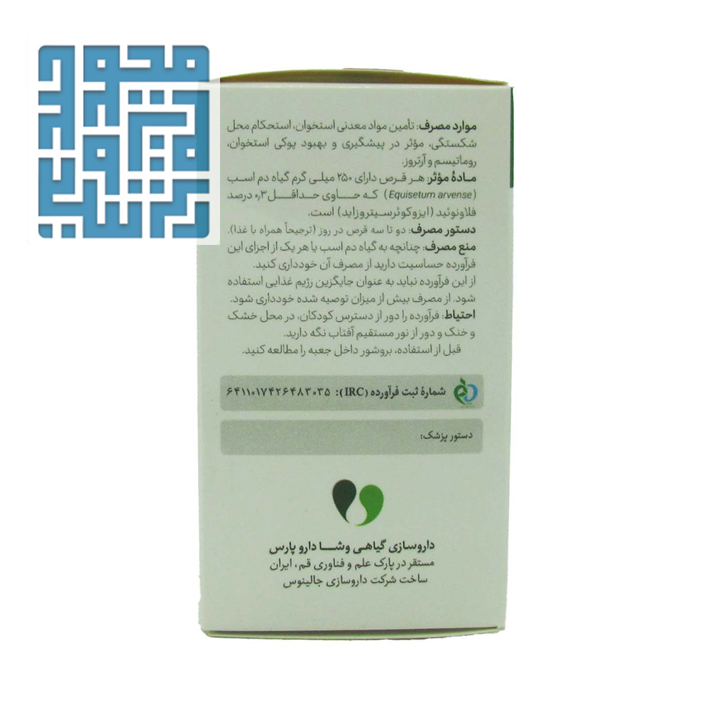 این مکمل گیاهی در فرم قرص طراحی شده و برای جذب بهتر مواد مؤثره آن، مصرف روزانه سه عدد قرص در سه نوبت صبح، ظهر و عصر توصیه میشود. ترجیحاً هر دوز از قرص دم اسب باید همراه با وعده غذایی مصرف شود تا هم جذب آن افزایش یابد و هم احتمال ایجاد ناراحتی گوارشی کاهش یابد. تقسیم دوز به سه وعده در طول روز، موجب پایداری سطح ترکیبات فعال در خون شده و در نهایت تأثیرات درمانی را به حداکثر میرساند.