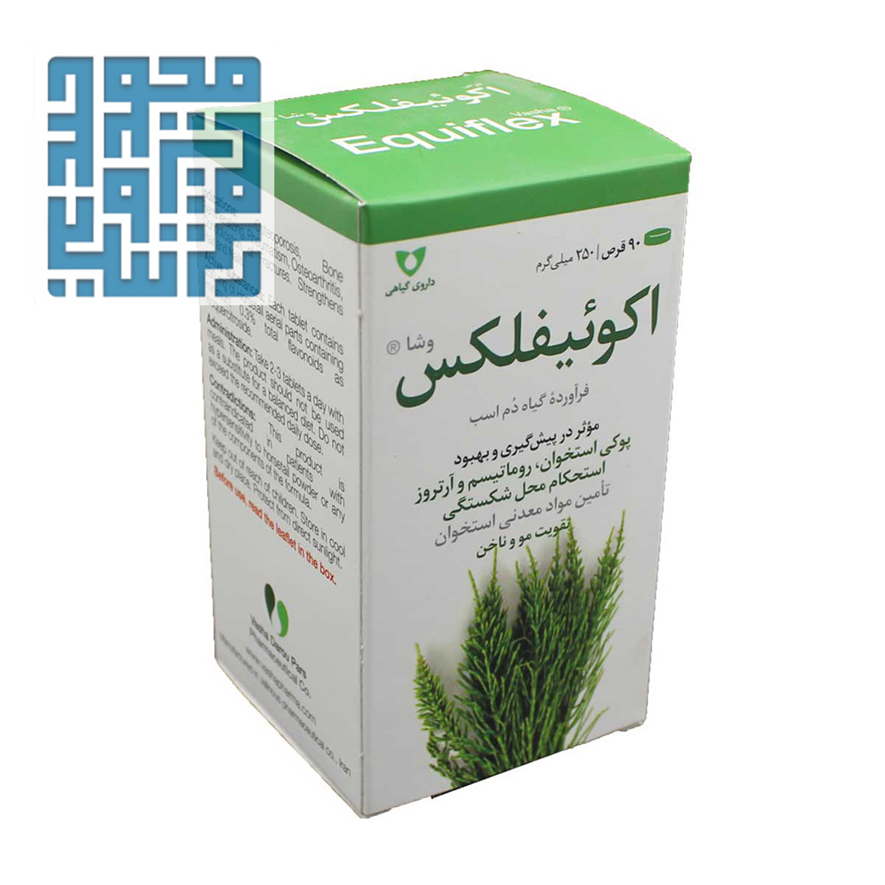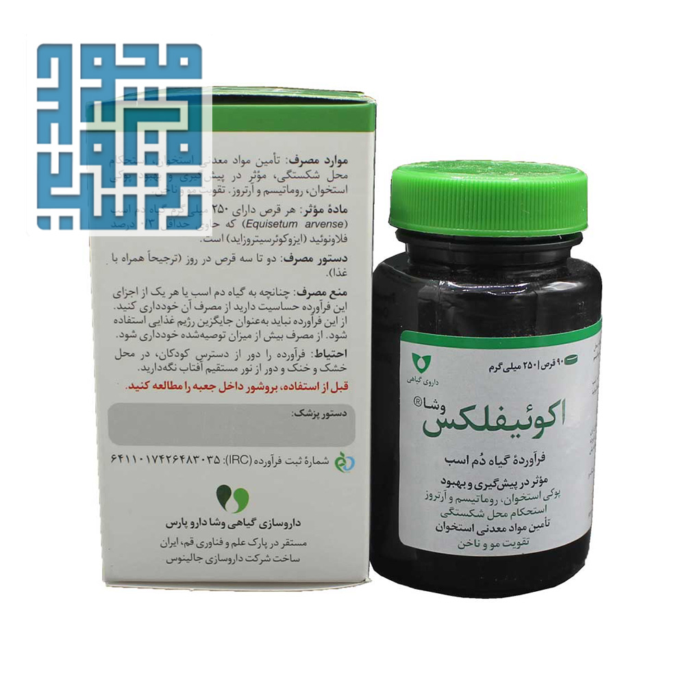 مکمل اکوئیفلکس وشا دارو توسط شرکت ایرانی وشا دارو پارس و در کارخانه داروسازی جالینوس تولید میشود و هر قرص آن حاوی ۲۵۰ میلیگرم پودر خشکشده از بخشهای هوایی گیاه دم اسب (Aerial Parts of Horsetail) است. قرص اکوئیفلکس در قالب یک قوطی پلاستیکی حاوی ۹۰ عدد قرص به بازار عرضه شده و با کد بهداشتی ۶۴۱۱۰۱۷۴۲۶۴۸۳۰۳۵ در گروه مکملهای کلسیم و تقویتی قرار میگیرد.