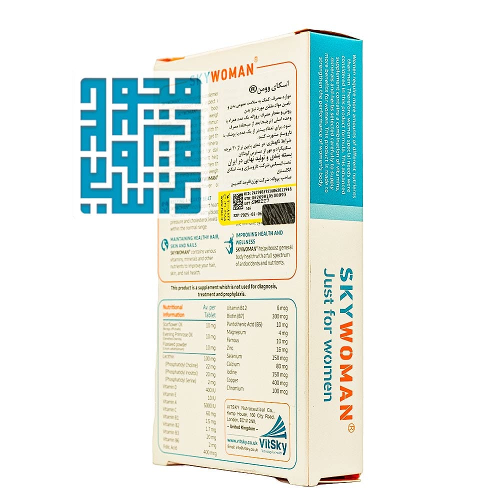 مولتیویتامین مینرال اسکای وومن یک مکمل زنان کامل برای سلامت بانوان به شمار میرود. قرص اسکای وومن ویت اسکای یک مکمل مولتیویتامین منحصربهفرد است که برای حمایت از سلامت زنان در شرکت نوژن فارمد کاسپین، تحت لیسانس اسکای ویت انگلستان تولید و در داروخانه آنلاین داروچی عرضه شده است. اسکای وومن با ویتامینهای ضروری، مواد معدنی و مواد گیاهی مفید، ترکیبی کامل از ریزمغذیها را برای بانوان فراهم میکند.