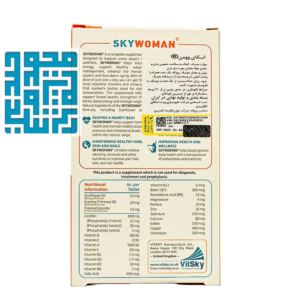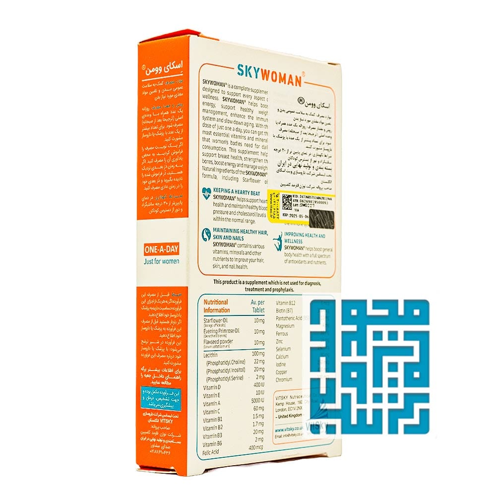 قرص اسکای وومن ویت اسکای یک مولتیویتامین بسیار فوقالعاده برای بانوان است. این مکمل حاوی لسیتین، دانه کتان، روغن گل مغربی و روغن گل ستاره بوده و به حفظ تعادل هورمونهای زنانه کمک میکند. قرص اسکای وومن ویت اسکای به دلیل داشتن ویتامین B انرژی روزانه بدن را تأمین میکند، همچنین وجود ویتامینهای D، E و زینک در این مکمل به تقویت سیستم ایمنی بدن کمک میکنند.