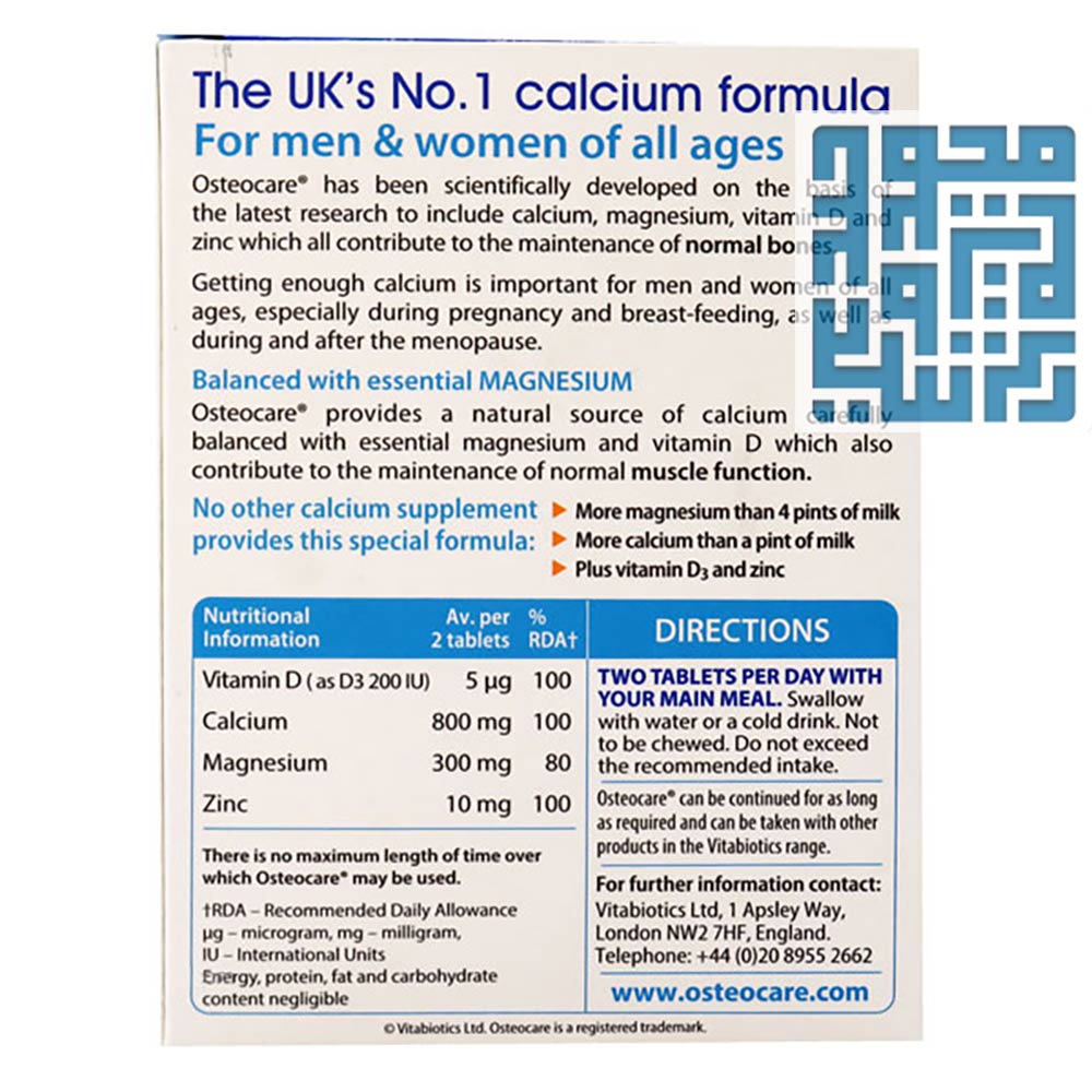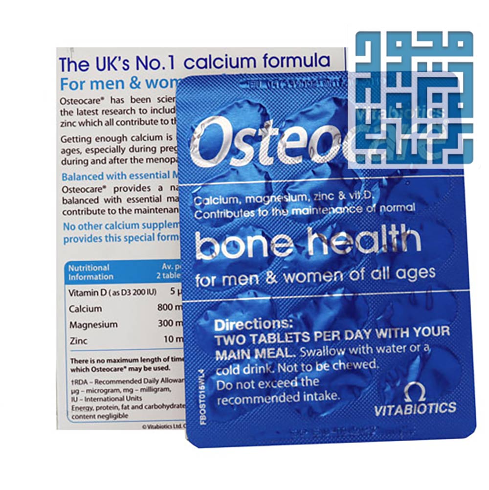 روی یکی دیگر از ترکیبات موجود در قرص استئوکر ویتابیوتیکس است. روی یک ماده معدنی ضروری برای رشد و نمو، سیستم ایمنی و سلامت پوست بوده و به جذب کلسیم هم کمک میکند. آخرین ترکیب موجود در این مکمل ویتامین D3 بوده که برای جذب کلسیم ضروری است. برای مصرف قرص استئوکر ویتابیوتیکس در بزرگسالان روزانه یک قرص همراه با غذا یا آب میل شود و در کودکان 10 الی 12 سال روزانه نصف قرص همراه با غذا یا آب مصرف شود. توجه داشته باشید افرادی که حساسیت به هر یک از ترکیبات قرص، سنگ کلیه، اختلالات کلیوی و اختلالات جذب کلسیم دارند، نباید از این مکمل استفاده کنند.
