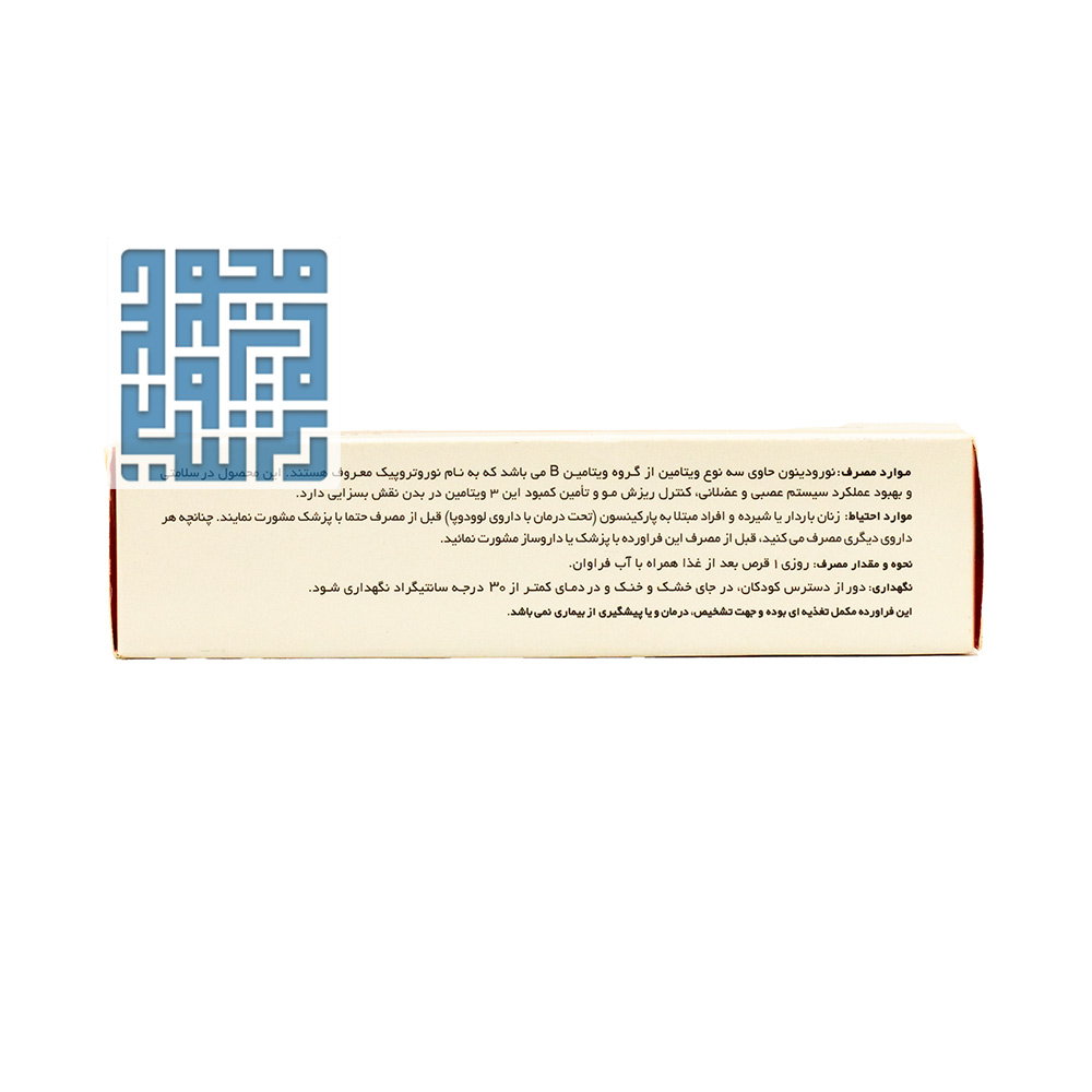 مکمل ب کمپلکس نورودینون در بستهبندیهای ۳۰ عددی و به شکل قرص عرضه میشود و با استفاده از فناوری پیشرفته، فاقد هرگونه مواد نگهدارنده و طعمدهنده مصنوعی است.