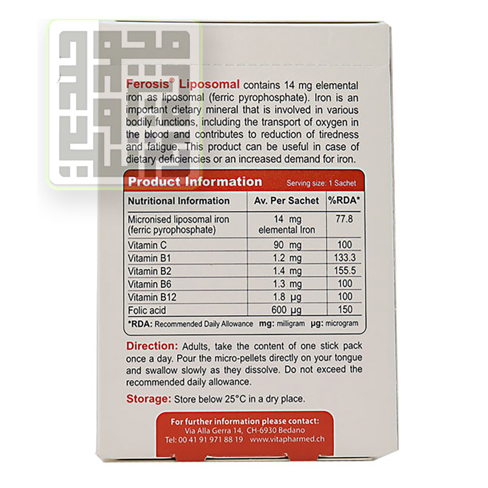 ویتامین C باعث افزایش بیشتر جذب آهن شده و ساشه لیپوزومال فروسیس ویواتیون را به ویژه در درمان کم خونی و کاهش علائمی مانند خستگی و ضعف موثر میکند. مشخصات مواد مغذی جامع مکمل آ]ن لیپوزومال فروسیس ویواتیون نه تنها از تولید هموگلوبین و گلبولهای قرمز خون پشتیبانی میکند، بلکه به کاهش خستگی و خستگی، تنظیم خلق و خو و بهزیستی کلی کمک میکند.