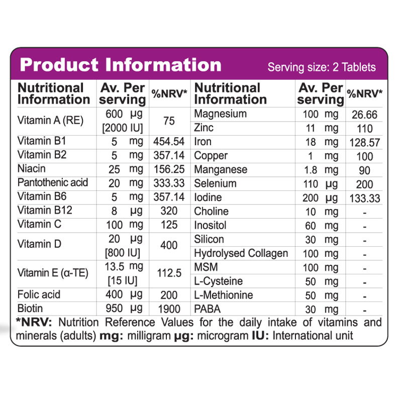 ویتامین آ، ویتامین ب۱، ویتامین ب۲، نیاسین، پانتوتنیکاسید، ویتامین ب۶، ویتامین ب۱۲، ویتامین ث، ویتامین دی، ویتامین ای، فولیکاسید، بیوتین، منیزیم، زینک، آهن، مس، منگنز، سلنیوم، ید، کولین، اینوزیتول، سیلیکون، کلاژن هیدرولیز شده، متیل سولفونیل متان، ال سیستئین، ال متیونین، پارا آمینو بنزوئیکاسید